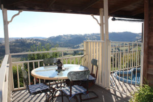 The bed faces two French doors that lead to a private balcony complete with table and chairs, long church pew, an optional outdoor hot/cold shower, bird feeder and garden views. From within the room, a large picture window overlooks the elevated veranda with gorgeous long distant valley views.